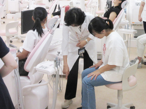 臨床実習室で、歯科用チェアユニットの操作方法について学んでもらいました