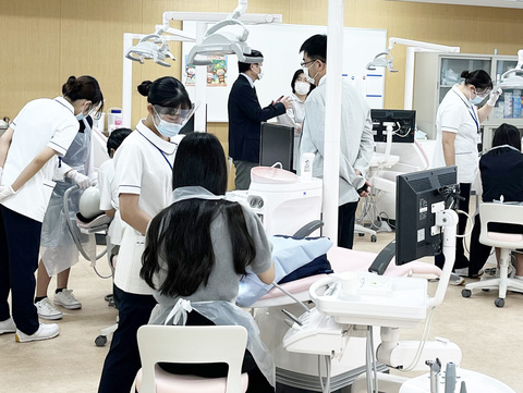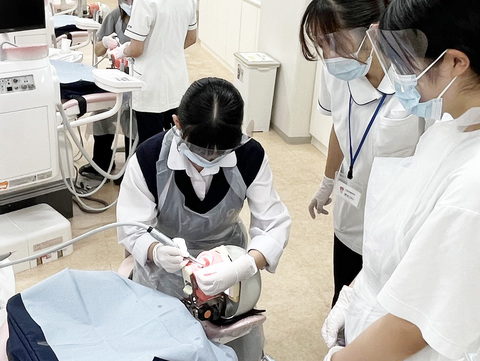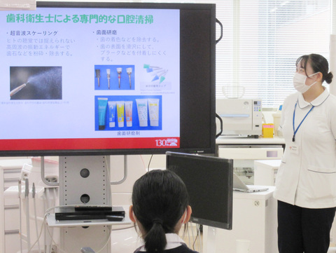 歯科用チェアユニットとマネキン模型を使用した、専門的な口腔清掃の実習を体験しもらいました