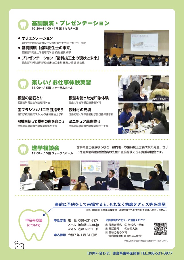 公開日 2024年12月20日 徳島県内の歯科衛生士養成校の五校は2月11日[日]に、生徒と保護者の皆さんに向けたお仕事体験と進学相談会を開催します 参加のお申し込みは下のボタンよりお願いします 参加申し込みはこちら 相談会の会場は四国大学交流プラザです