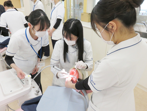 模擬授業とともに行われた体験実習では、歯科用チェアユニットを使って…
