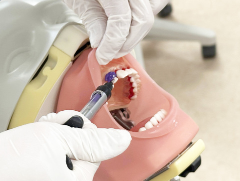 こちらの学生は精密印象採得として行われることの多い、寒天アルジネート連合印象の実習を行っています。