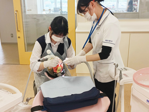 エアフローによる歯のクリーニングの実習を行ってもらいました