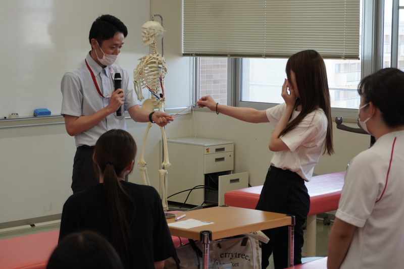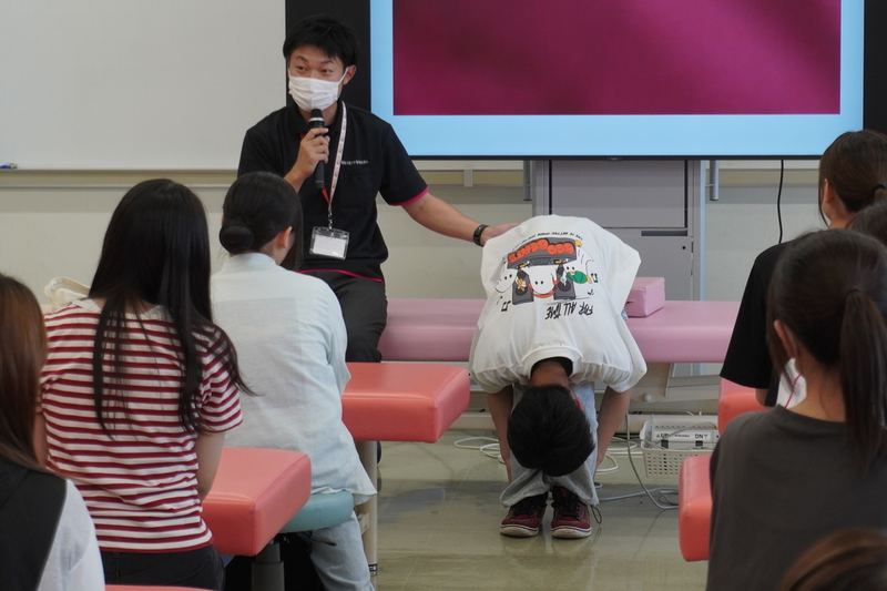 少し、皆さんの緊張がほぐれたところで理学療法体験を行いました。