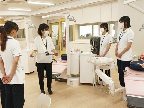 応援に参加してくれた在校生たち、模擬歯科診察室でハイポーズ!( ̄∇ ̄)