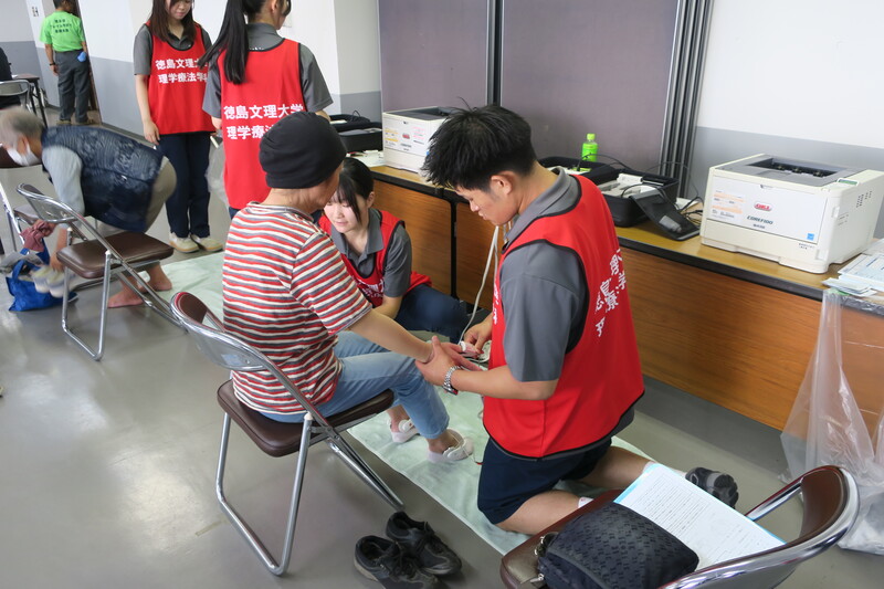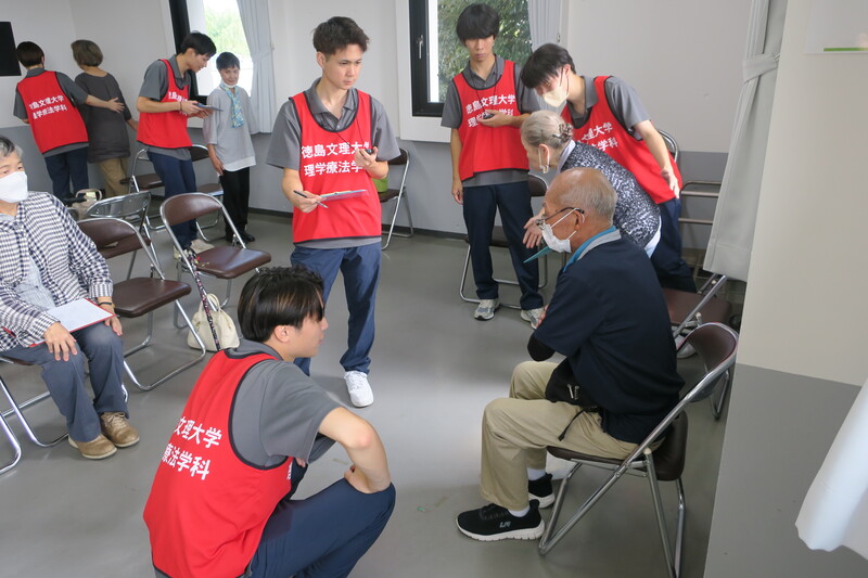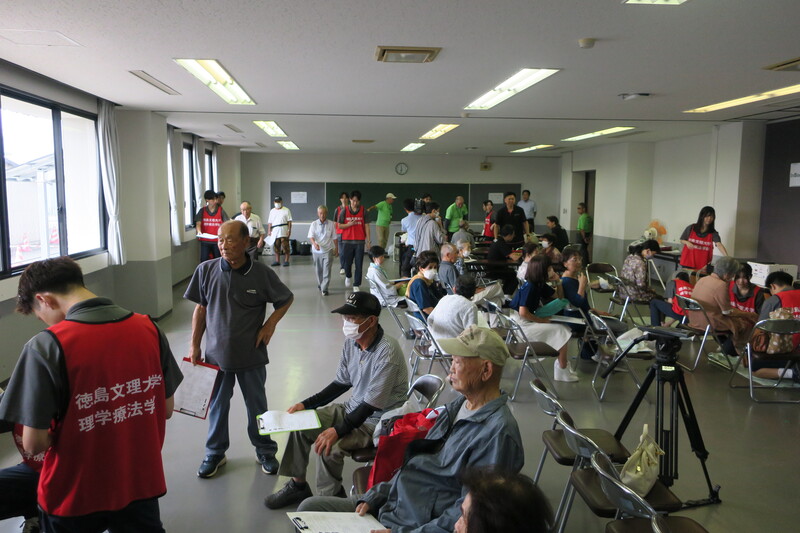 理学療法学科は、20名以上の3年生学生と教員3名で参加し、上板町町制施行70周年記念事業の一環として広い部屋でフレイルチェックを行わせていただきました。