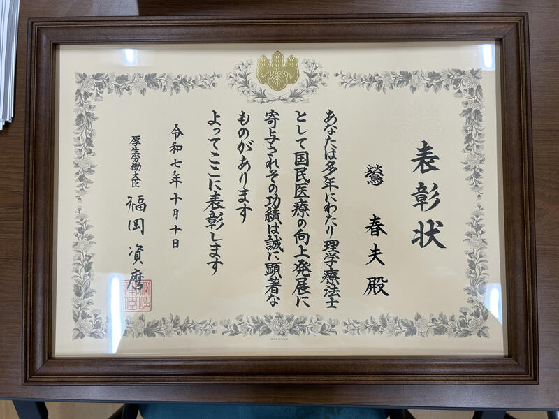 本学科学科長の鶯春夫氏が理学療法の発展や後進の育成に貢献した