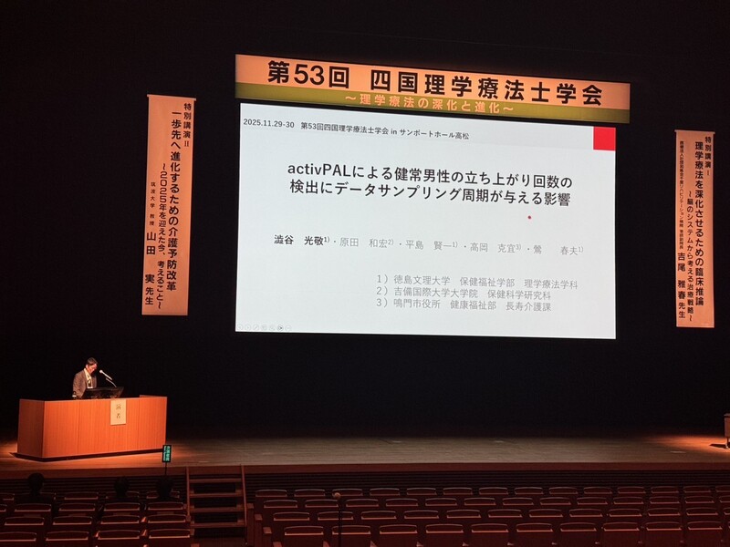 また、教員渋谷も「activPALによる健常男性の立ち上がり回数の検出にデータサンプリング周期が与える影響」という題目で口頭発表しました。
