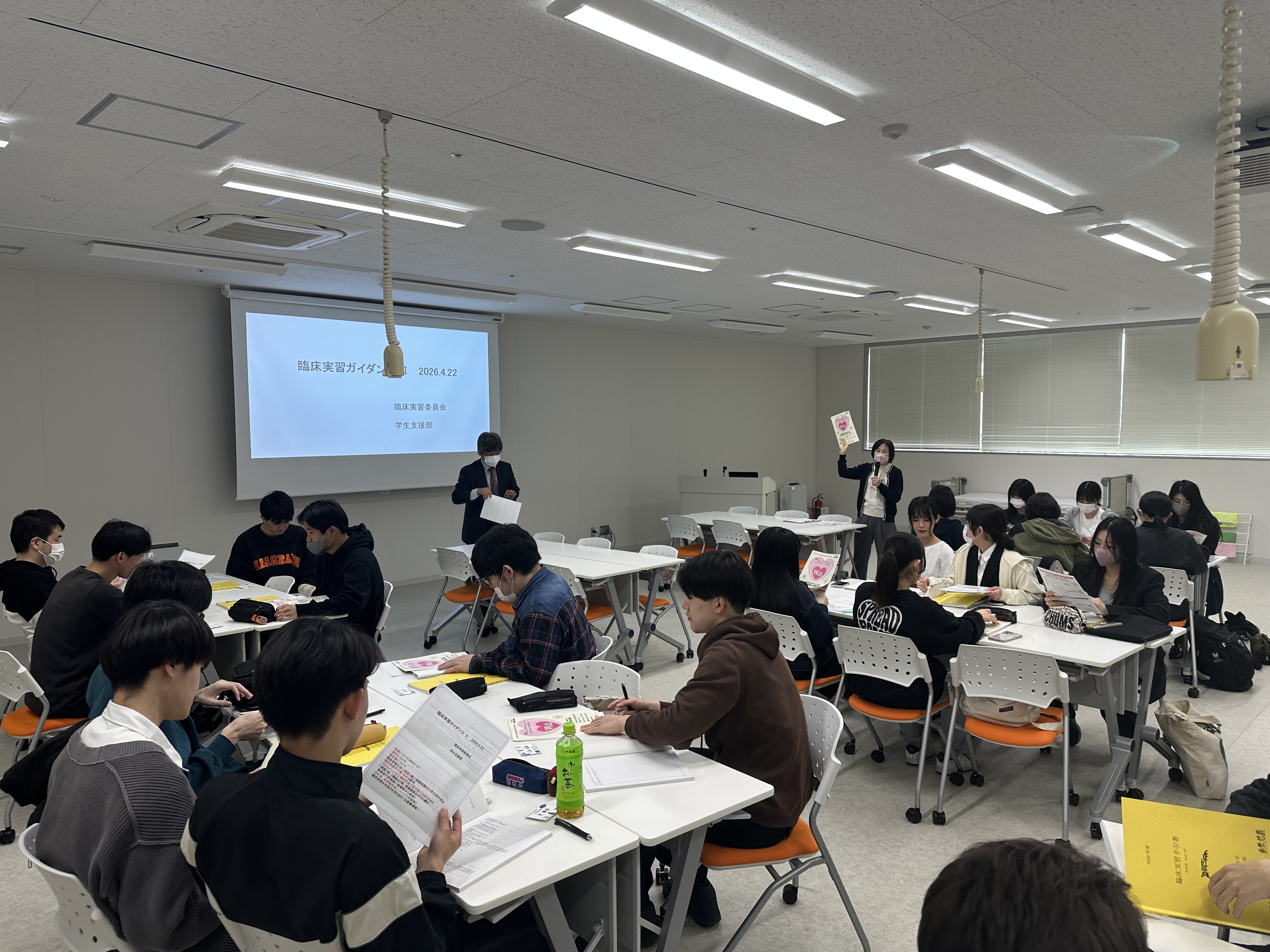 前半のガイダンスでは、教員と学生支援課職員から、実習手引書の確認をはじめ、保険の手続きや通学定期など、実習にあたっての諸注意について丁寧に説明が行われました。