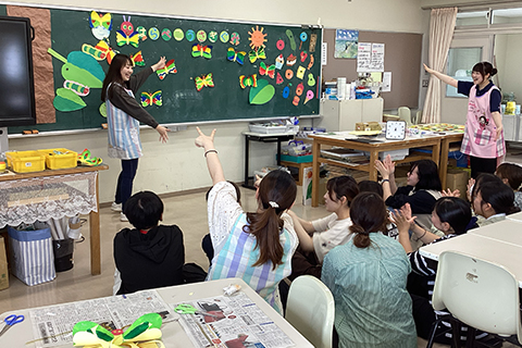 子どもたちが大好きな粘土で本番さながらの模擬保育をしています(上写真)。また、絵具、クレヨンや身近な画材や材料などを使って「誰もが芸術家」になれるような造形表現活動をおこなっています。
