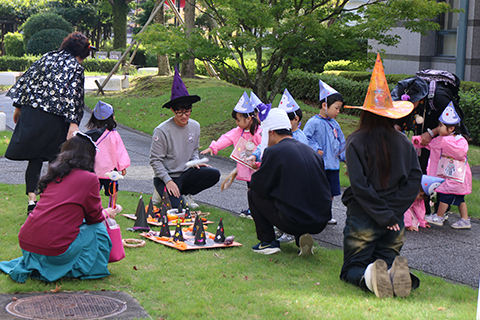 文理大学附属幼稚園の子ども達と様々なイベントを通じて交流をおこない、その中のハロウィンは、大学内で学生と楽しいゲームなどで盛り上がります。