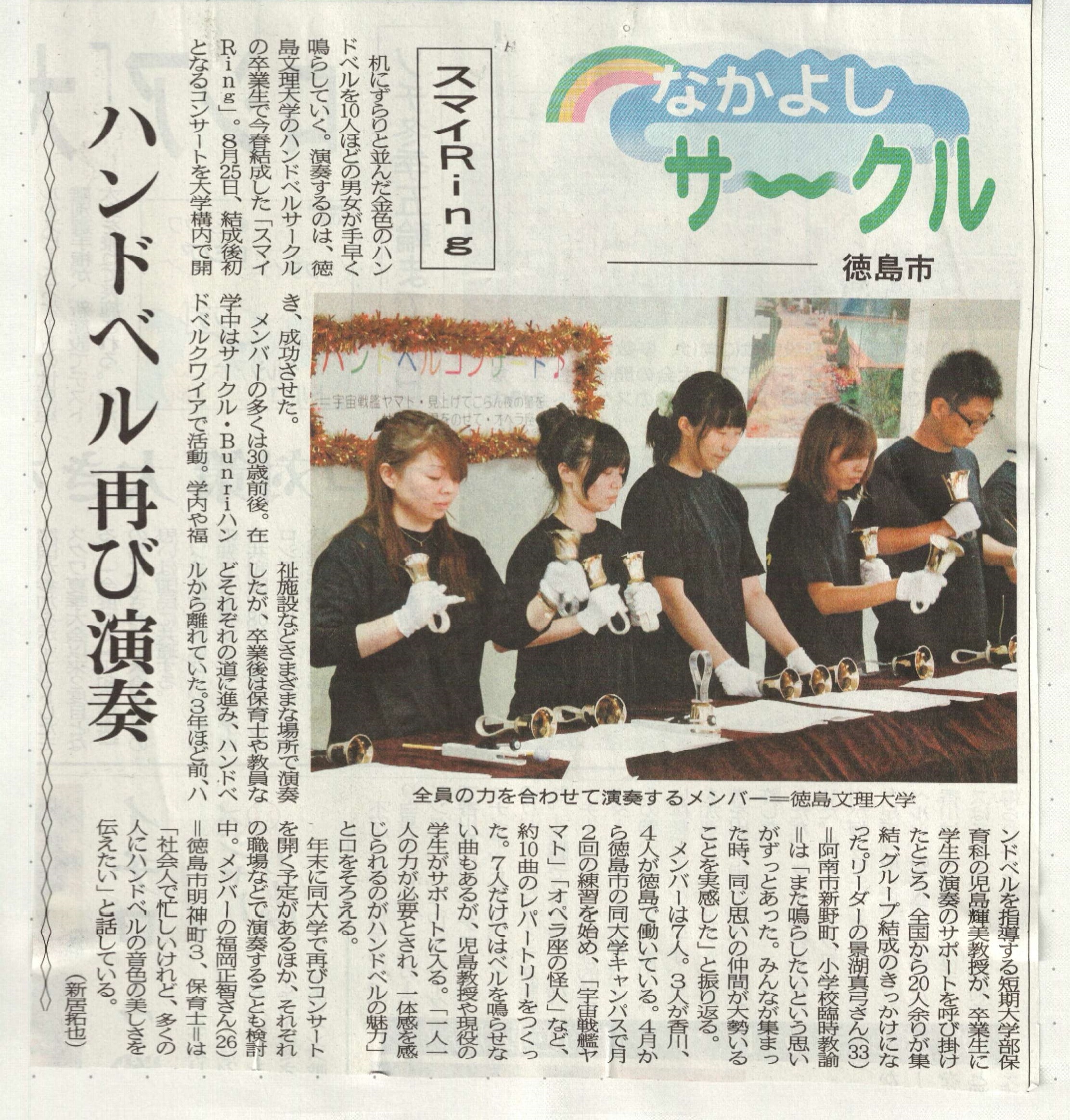 公開日 2012年09月26日 9月25日(火)の徳島新聞の夕刊に、ハンドベルサークル“スマイRing”の紹介記事が掲載されました。 このサークルはBunriハンドベルクワイアの卒業生によって結成されたものです。これからも活動を継続していきますので、ハンドベルに関心のある方(卒業生以外も歓迎)ぜひご参加ください。 お問い合わせは保育科児嶋(602−8282)まで。