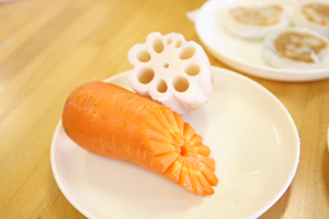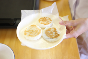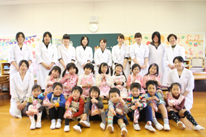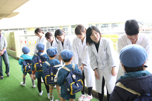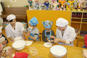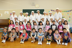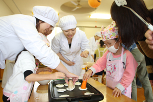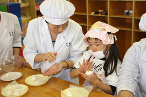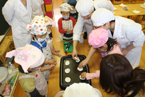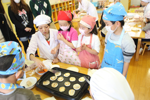 生活科学科食物専攻の学生と先生で、郷土野菜や料理の話を聞いた後、園児と学生で地元の特産のサツマイモ(鳴門金時)を使った「焼き餅」を作って、「あわばん茶」とともに食べました。