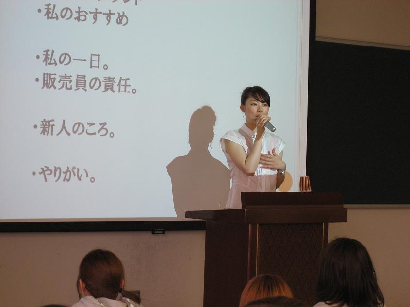 日浦さんは平成20年3月に短期大学部を卒業した先輩で、バリバリ働いている姿が目に浮かびました。仕事で着る洋服は、お客様に販売する商品を格安の値段で購入しているそうで、自らが商品を着用することで自信を持ってお客様にお勧めできるようです。洋服に関することだけでなく幅広い知識が必要で、来店されたお客様の顔を覚えるのが重要だとか。本人は気づいていないけど、試着した洋服が似合っていないお客様もいますよね。そういう場合、「お客様が気に入っているんだから・・・」とそのままにしておくのは、お客様に恥ずかしい思いをさせることになりかねません。では、どう対応するのが良いんでしょうか? 日浦さんのお話には、「なるほど!」とうなずかされました。