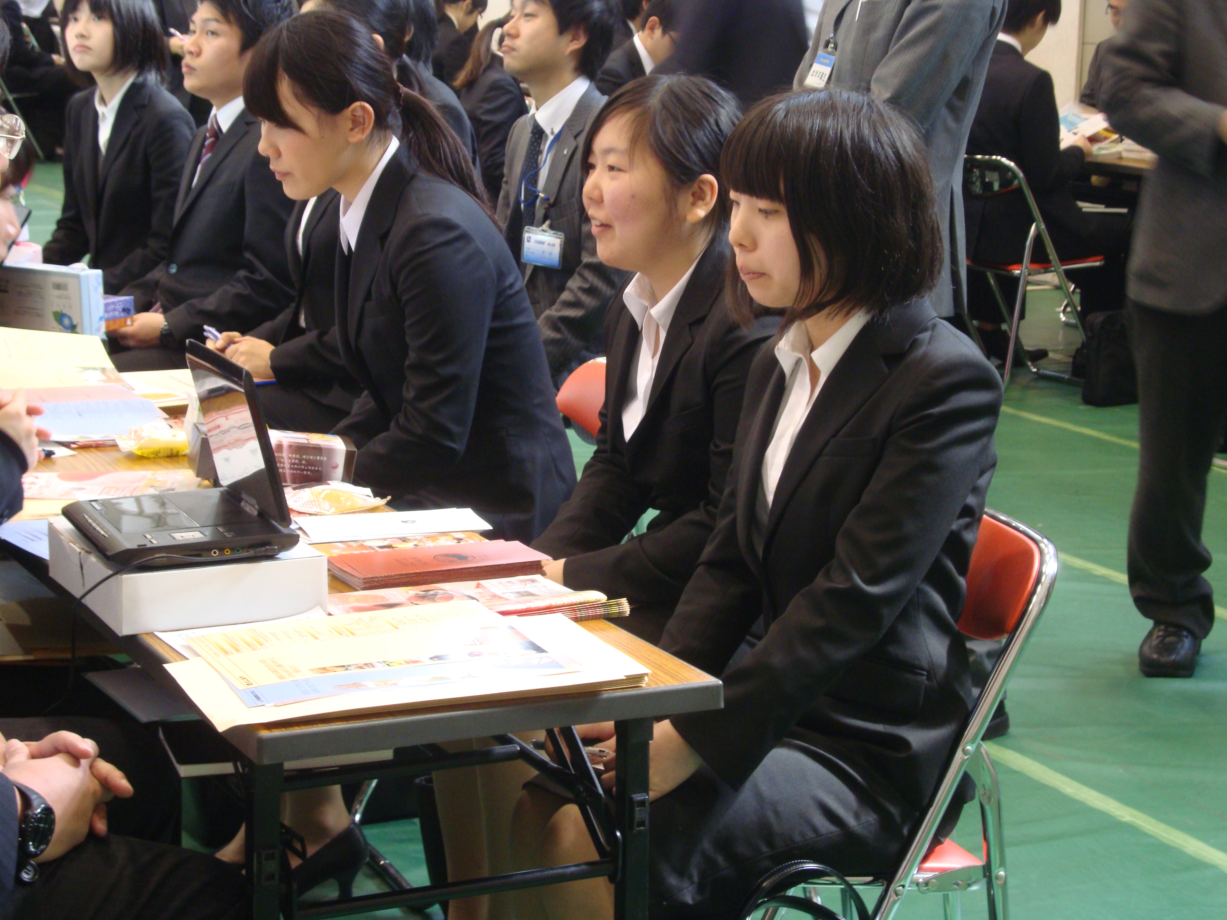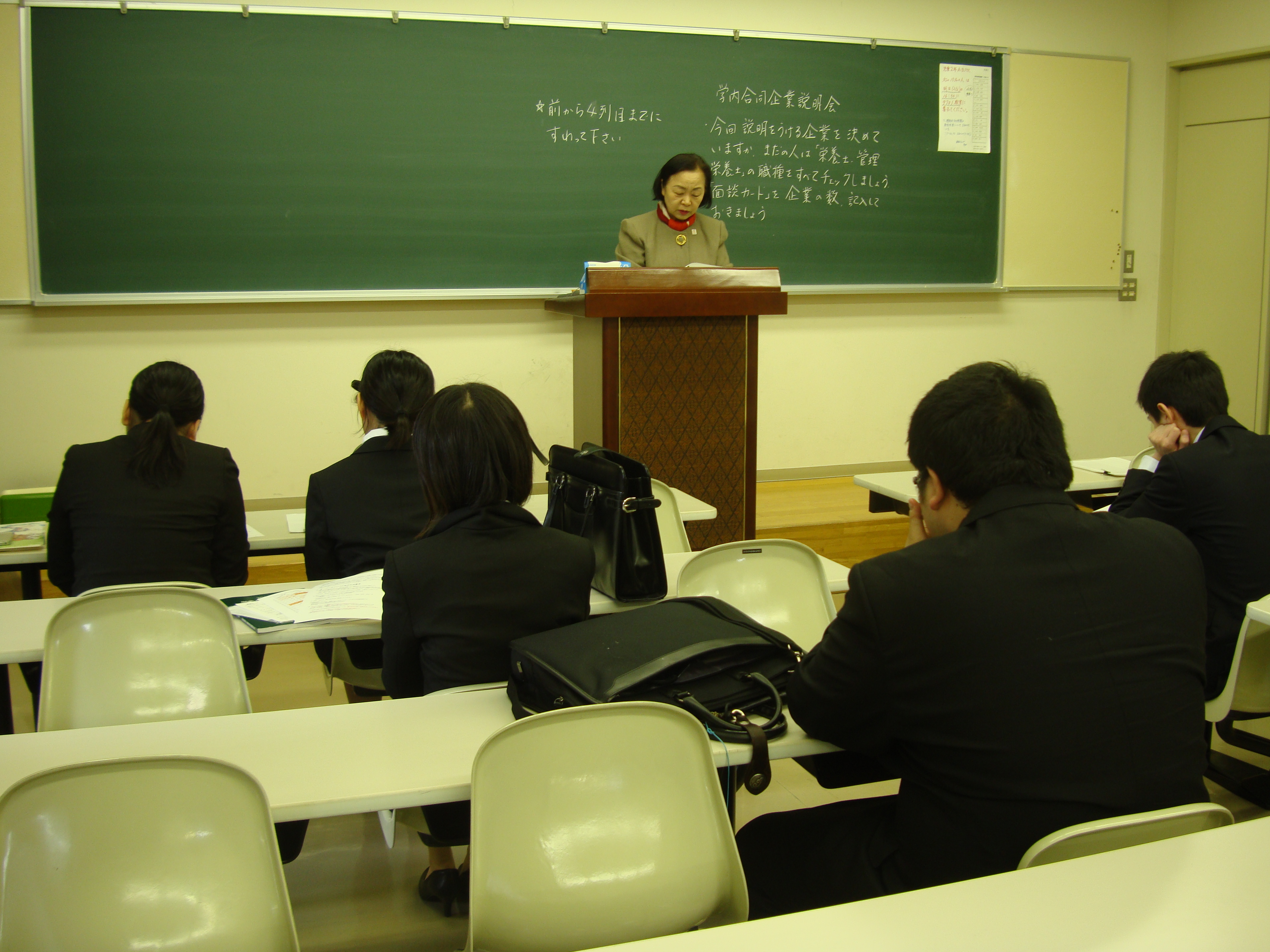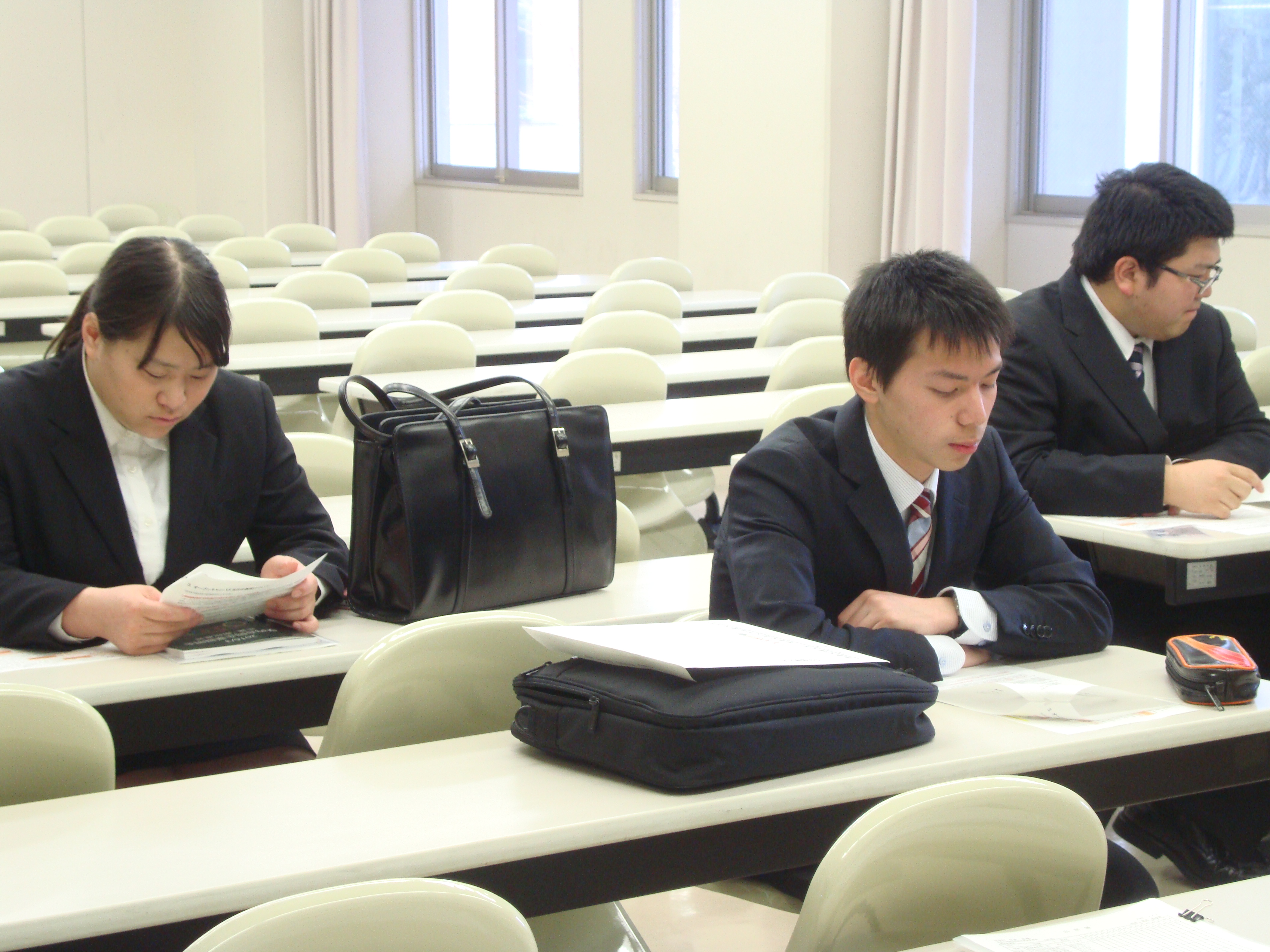 公開日 2016年03月11日 3月5日(土)、6日(日)に実施された学内合同企業説明会は、県内外から288社もの企業が参加する就職活動の第一歩です。企業の人事担当者から、現場の生の話を聞ける貴重な機会となります。前日に事前セミナーがあり、説明会に参加する際の注意事項などを聞きました。 当日はまず、ホームルームで説明会に臨む心構えについて確認があります。 さあ、学内合同企業説明会の開催です。 真剣に企業の人事担当者から説明を受けています。