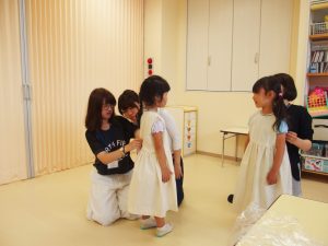 「園児デザインの服を作る!」仮縫いができました。フィッティングをしてもらうため、みずほ保育園へみんなで出かけました。