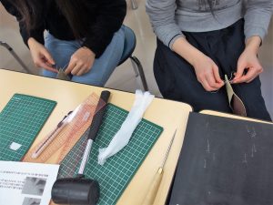 講師に鈴木カバン制作室の鈴木僚先生をお招きし鹿革の特徴について講義を受けた後、