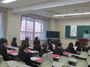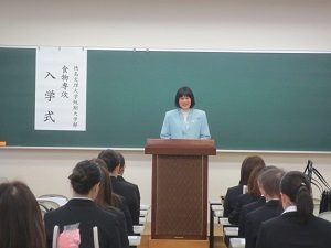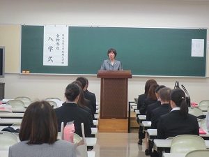 式典の後は初めてのホームルームです。食物専攻の先生やチューター(担任)より、栄養士の資格や学業、大学生活についてのお話しがありました。