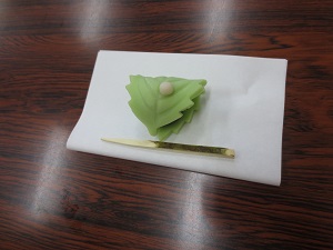 まずお菓子を頂きます。菓子名「落とし文」、季節感あふれる上生菓子です。