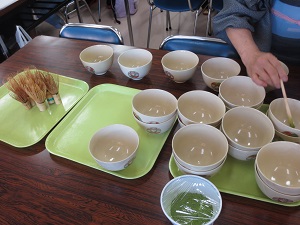 茶筅を動かすことによって空気を取り込み、きめの細かいふんわりとした泡が立ちます。この茶筅の扱い方に、皆さんなかなか苦労していました。またお湯の量が多すぎると、きれいな泡が立ちません。やはり適量というものが大事です。