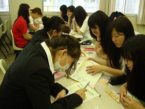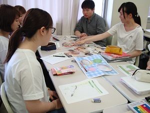 グループに分かれて先輩から説明をうけ、食事バランスガイドに基づき自分の食事内容(朝食と昼食)を記入します。