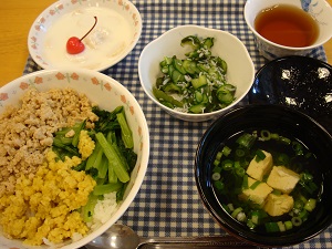 本日の献立は、三色ごはん、きゅうりの酢の物、豆腐のすまし汁、バナナヨーグルトです。