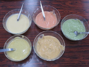 食材の色によって、色とりどりの流動食ができました。自分の班のものはもちろん、他の班のものも試食しました。