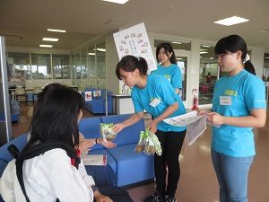 来場者一人ひとりに、「栄養の日」を紹介し、プレゼントを配布しています。