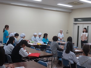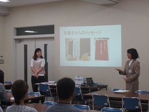 9月24日のオープンキャンパスでは卒業生の方が高知から駆け付けて、栄養士の仕事内容や、学科の学びが社会に出てどのように役立つのかお話しをしてくださいました。