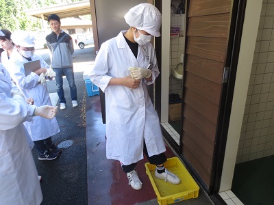 白衣に着替え、施設についての説明を受けます。施設に入る前に靴底を消毒します。