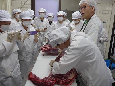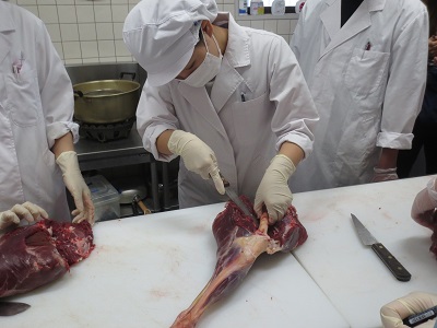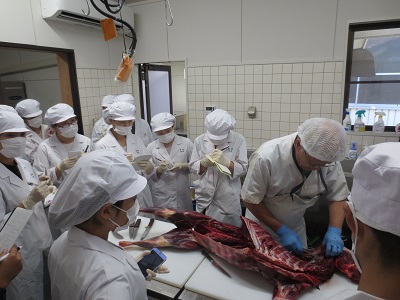 午後からは木沢シカ肉等加工施設にて、管理人 平井様から枝肉の状態からの解体方法を教えていただきました。