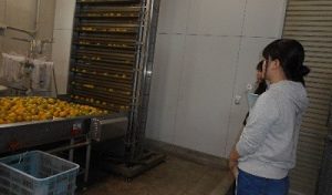 工場にしつらえてある計測装置で「柚子」の重量の計測した後、選別をしています。