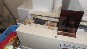 菌床にしっかりくっついている椎茸を収穫し、包装器でパックしました。