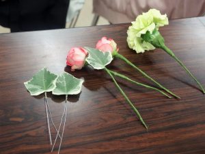 お花や葉に針金の足をつけてフラワーテープで巻いていきます。