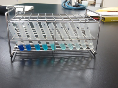 調製の済んだそれぞれの液を試験管立てに並べます。目視で濃度の濃さを確認します。