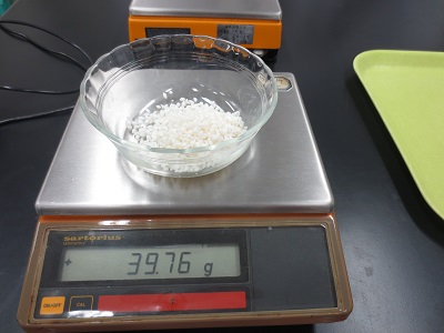取り出した米は割らないように気をつけながらペーパーで押さえ、周りの余分な水を取り除いたのち、重量をはかって吸水量を求めます。