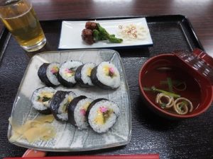 和食:巻きずし、すまし汁、三種盛り(鶏だんご、花れんこん、ししとうがらし)