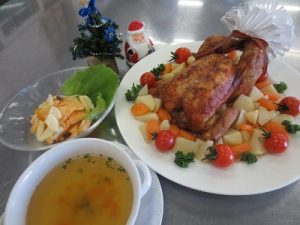 洋食:ローストチキン、コンソメスープ、果物のサラダ