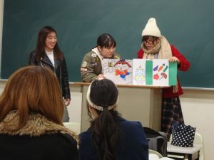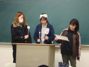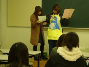 通常は講義形式で行う授業ですが、今日は子どもたちの食育に用いる媒体を使って、栄養指導の体験をしています。