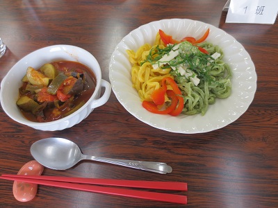 本日はエコ野菜うどん、ラタトゥイユ、錦玉羹を作りました。