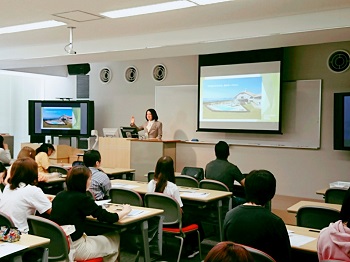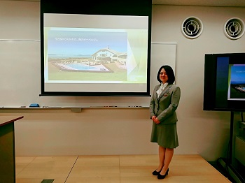今回の授業では、ホテルで働いている入社3年目の商科卒業生を講師としてお招きし、講義・質疑応答を行いました。
