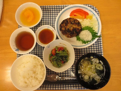 本日の献立は、ご飯、和風ハンバーグ、小松菜とミニトマトの胡麻和え、ワカメの味噌汁、みかんゼリーです。