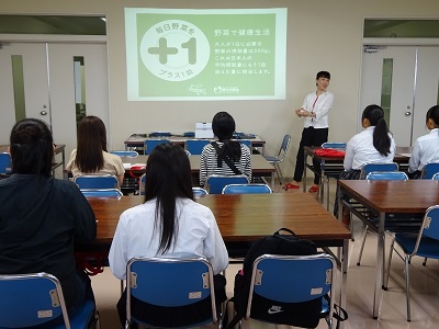 学科説明会において、「食事をおいしく、バランスよく」食べることの大切さ、「毎日プラス1皿の野菜」「おいしく減塩マイナス2g」および「毎日のくらしにwithミルク」を解説しました。