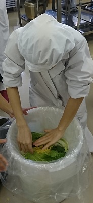 各班で白菜1玉を1/4にカットし流水で洗い、白菜重量の4%の食塩をまんべんなくまぶします。