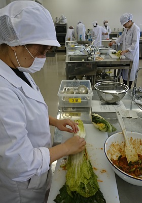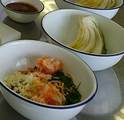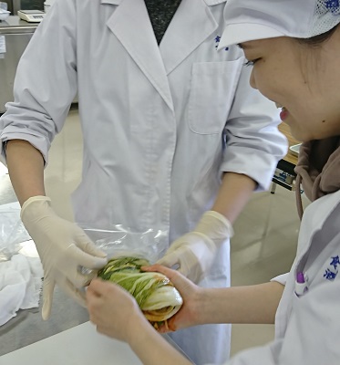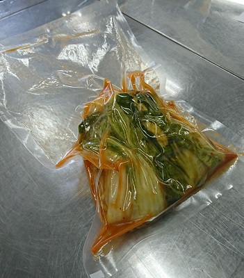 必要な材料を計量、カットし調味料と合わせ、塩漬け白菜の軸を中心に、合わせたキムチの材料を層にして挟み込み、最後は白菜の葉と軸を丸めて真空パックにしました。