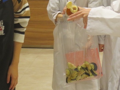 専用の袋に食材と調味液を入れ、真空包装機でパックしました。