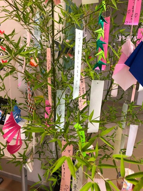 公開日 2020年07月07日 25号館8階に立派な七夕飾りを作っています。 保育科の学生が飾り付けをして、願い事を書いた短冊をつけました。 今日はあいにくの雨模様ですが、夜には晴れたらいいですね。みなさんも夜空をみあげて願い事を託してみてください。コロナウイルスや集中豪雨など…禍が早く収まりますように。