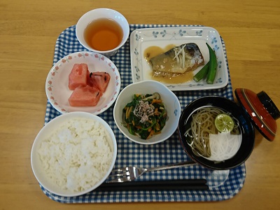 献立:サバの味噌煮、ほうれん草のおひたし、そうめんすまし汁、スイカ。