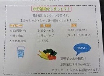 熱中症予防として水分補給について取り上げ、資料配布も行いました。