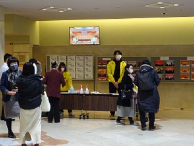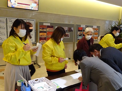 そして、受付係は来場者の検温、住所氏名の記帳依頼、パンフレットの配布