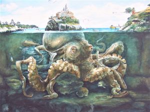 一見不気味で強そうな巨大なタコですが本当は孤独で淋しいのです。いつも暗い海中に隠れているのですが明るい地上への憧れを持っています。そんなタコは頭の先を水面から出して小さな町を作りました。それは少しでも地上の人々と接触を持ちたいと思ったから…